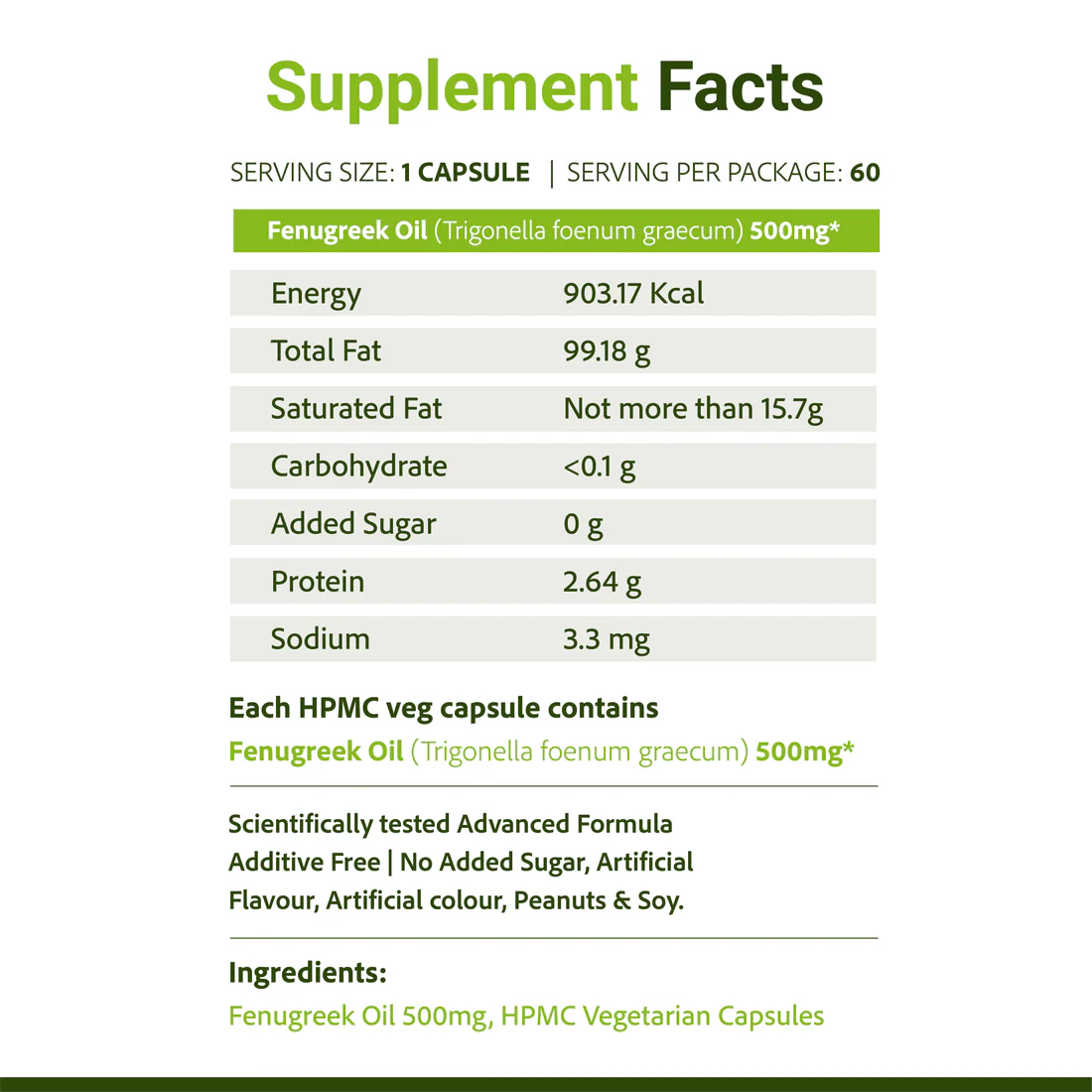 Ingredients: 500 mg Fenugreek Oil per capsule, enclosed in HPMC vegetarian capsules. Dietary Features: The capsules are vegan, gluten-free, dairy-free, and contain no added sugar or harmful chemicals. Target Audience: Specifically designed for adults over 40, though it is also noted as beneficial for lactating mothers to support milk production.