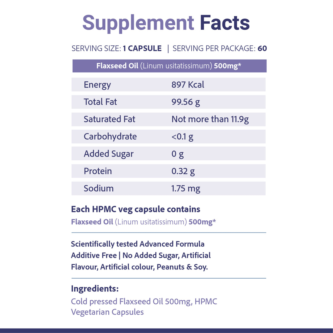 Main Ingredient: 500 mg of cold-pressed flaxseed oil per capsule. Capsule Type: HPMC vegetarian capsules, making the product vegan-friendly. Quantity: 60 vegetarian capsules per bottle. Dietary Compatibility: The manufacturer states these capsules are keto-friendly, dairy-free, gluten-free, and contain zero sugar or carbs. Dosage: Recommended intake is 2 capsules once a day after food, or as directed by a physician.
