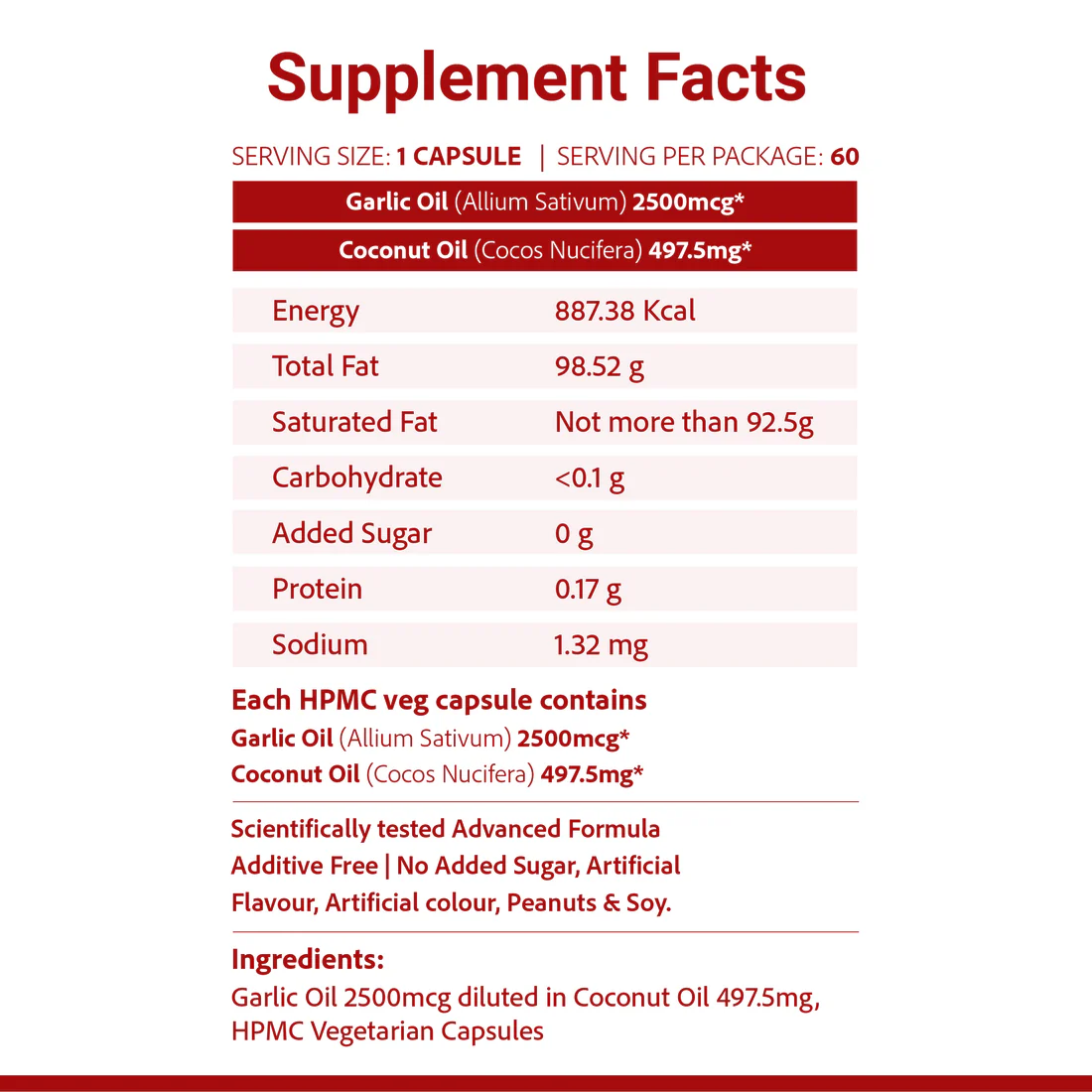 Form: 500 mg Vegetarian Capsules (HPMC). Quantity: 60 capsules per bottle. Main Ingredients: Garlic Oil (standardized to 0.5% Allicin) and Coconut Oil. Dosage: Take one capsule daily after food, or as directed by a healthcare professional. Dietary Features: 100% Vegan, non-toxic, and gelatin-free.