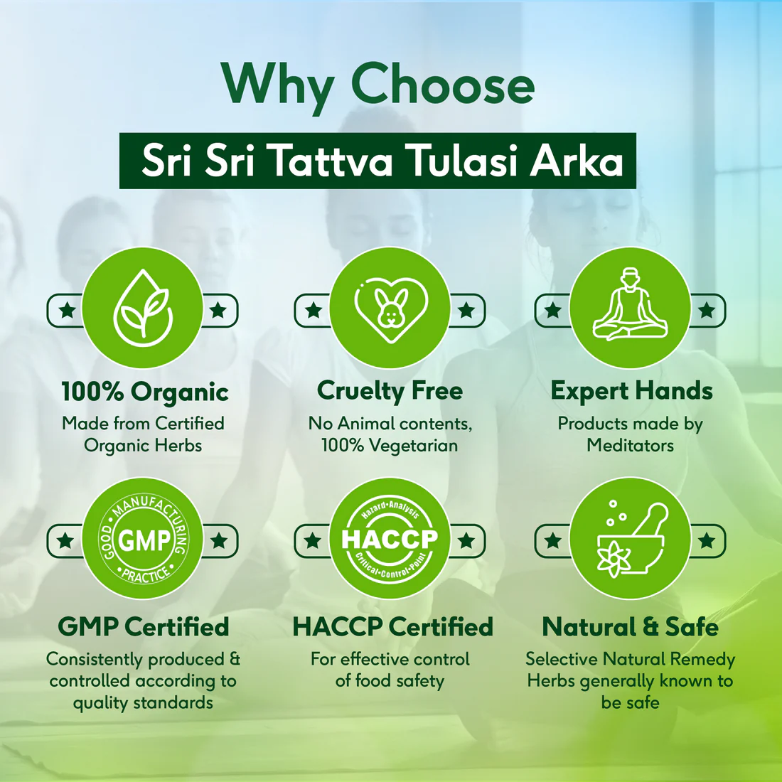 Sri Sri Tattva Organic Tulasi Arka is an Ayurvedic liquid formulation designed to boost immunity and support respiratory health. It is primarily used to relieve symptoms of common ailments like cough, cold, sore throat, and hiccups. Truemeds Truemeds +3 Key Benefits & Uses According to Ayurvedic principles, this formulation is effective for several respiratory and systemic conditions: Respiratory Support: Helps clear airways, reduce congestion, and manage conditions like bronchitis and bronchial asthma. Immunity Booster: Regular use strengthens the body's natural defenses against bacterial and viral infections. Relief from Minor Ailments: Useful for treating persistent hiccups, nausea, and symptoms of malaria. Anti-Inflammatory Properties: Contains bioactive compounds that help reduce inflammation in the respiratory tract.
