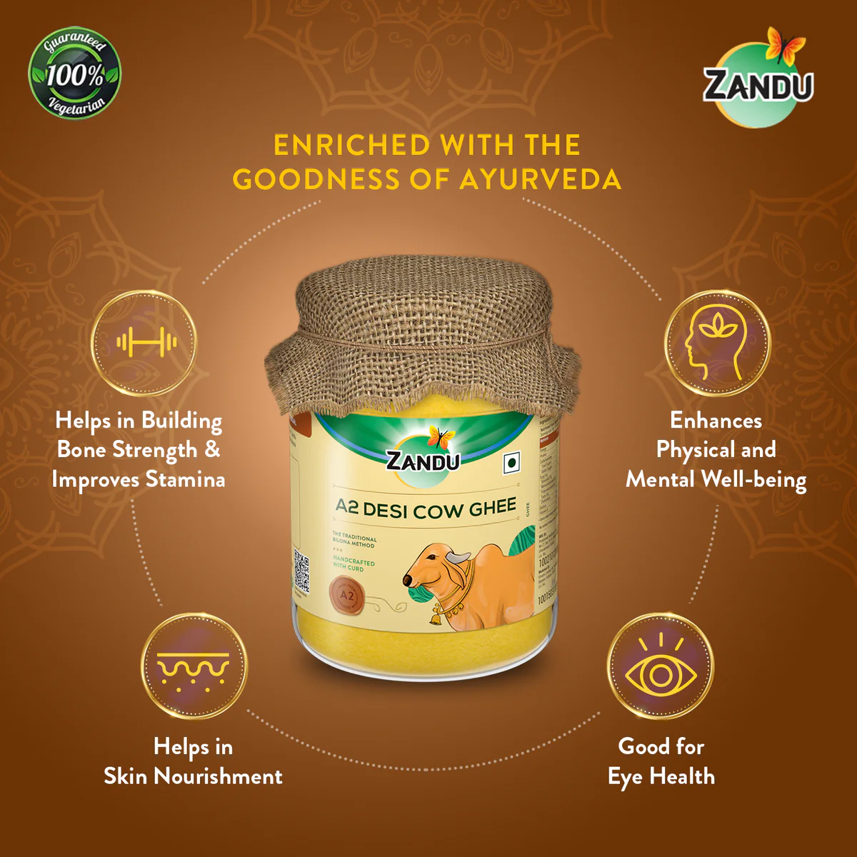 Traditional ghee is sometimes considered to be fattening, this has led to consumers using ghee sparingly, despite its delicious taste and health benefits. Thankfully, there has been a growing awareness about Ghee and its health benefits, which and people have started using it in their daily diet. With Zandu A2 Desi Cow Ghee, we bring this healthier option to you in a convenient form. Make a healthier addition to your wellness routine by incorporating A2 Desi Cow Ghee into your everyday recipes. It offers a range of benefits for your bones, skin, and eyes while improving stamina and enhancing your overall physical and mental well-being.
