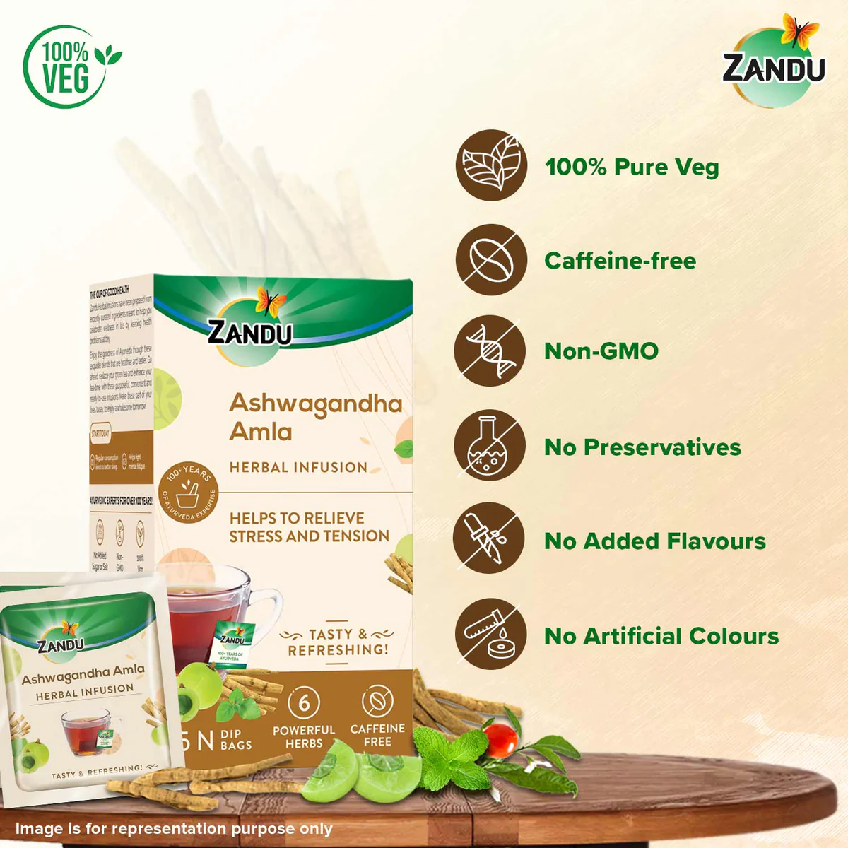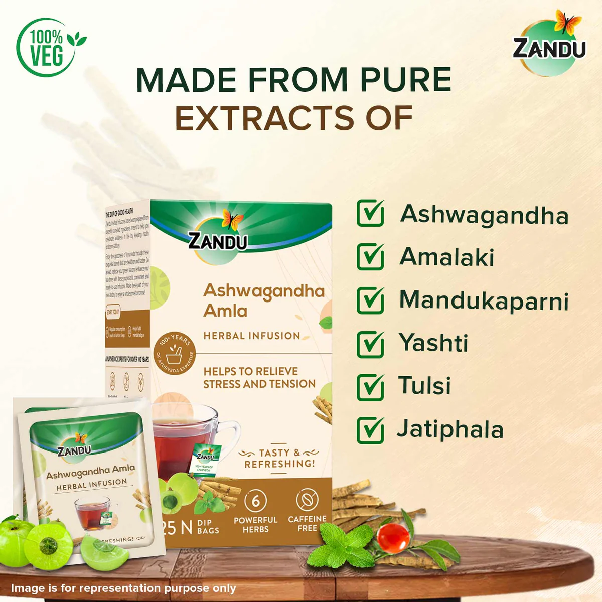 Are you looking for refreshing alternatives to green tea? Zandu brings you Zandu Ashwagandha Amla herbal tea infusion, a 100% organic tea bag made using six potent Ayurvedic herbs enriched with immunomodulatory, rejuvenating, and adaptogenic properties. Ashwagandha helps reduce stress while enhancing strength and improving mental performance. Amla is a powerhouse of vitamin C (ascorbic acid) that prevents aging and boosts immunity. Together, they can do wonders for our health.