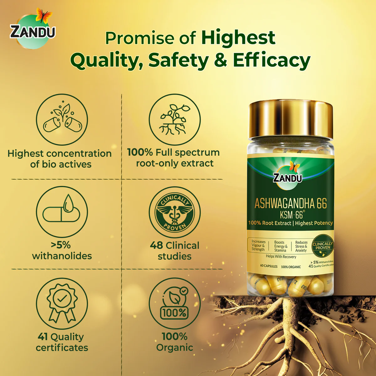 Presenting the purest Ashwagandha (Withania somnifera), Zandu Ashwagandha 66 (KSM-66®) capsules, a full-spectrum Ashwagandha KSM-66® root-only extract with the highest concentration of bioactives (with a herb-to-extract ratio of 15:1) for maximum potency. Being the purest root extract and produced through a proprietary milk extraction process without using any alcohol or chemical solvents, Zandu Ashwagandha 66 is one of the most effective forms of Ashwagandha.