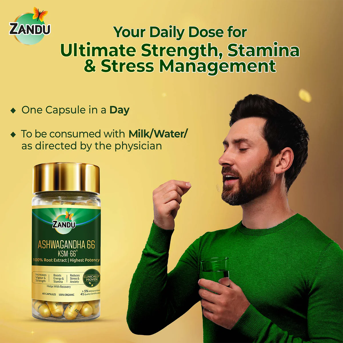 Our Ashwagandha 66 capsule is clinically proven to increase strength, stamina, vigour, and vitality while reducing stress and enhancing overall performance. It also helps boost muscle strength, muscle size, and muscle recovery. It is backed by 48 clinical studies to support its safety and efficacy, making it 100% organic, natural, and safe to consume. Furthermore, Ashwagandha 66 comes with the promise of quality, holding 41 quality certificates to ensure the delivery of a superior quality product to you. Incorporate Zandu Ashwagandha 66 (KSM-66®) capsules into your lifestyle and see your stress levels drop while increasing focus and calmness.