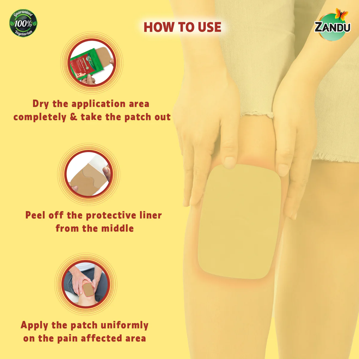 Developed by ZAARC (Zandu Advanced Ayurvedic Research Centre), this product benefits from Zandu's 100-year history and legacy. Experience the power of Ayurveda in a practical patch format, offering soothing comfort and supporting your active lifestyle. Say goodbye to knee pain and embrace the relief you deserve with our Ayurvedic Knee Pain Patch.