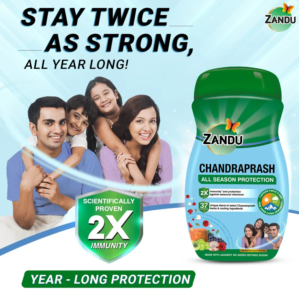 While seasons change, maintaining strength, stamina, energy, overall health, and unwavering immunity is vital. Hence, we introduce you to Zandu Chandraprash (Chyawanprash for Summer), a unique blend of 37 Ayurvedic ingredients, including selected herbs from chyawanprash and cooling ingredients, providing year-round immunity. In winter, it guards against cold and cough, ensuring warmth. Ayurvedic experts of ZAARC (Zandu Advanced Ayurvedic Research Centre), with decades of expertise in the field of Ayurveda, have prepared Zandu Chandraprash.