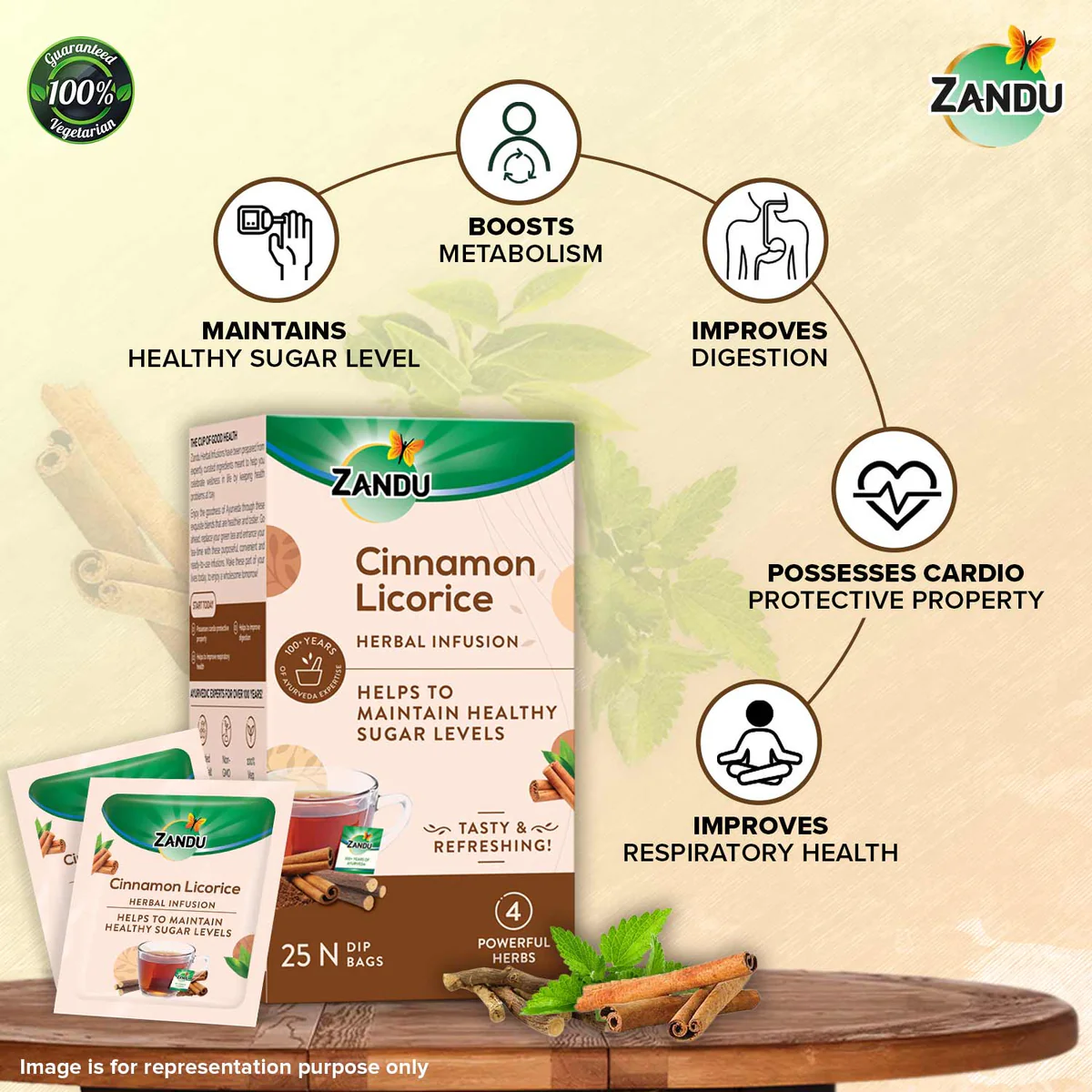 Introducing Zandu Cinnamon Licorice Herbal Tea Bags, a 100% Ayurvedic formula designed to lower blood sugar levels while boosting metabolism and supporting cardiovascular and respiratory health. Unlike any other herbal tea, it contains real extracts of potent herbs like Peppermint, Licorice, Cinnamon, and Green Tea, making it a perfect new-age Ayurvedic solution for a natural health boost.