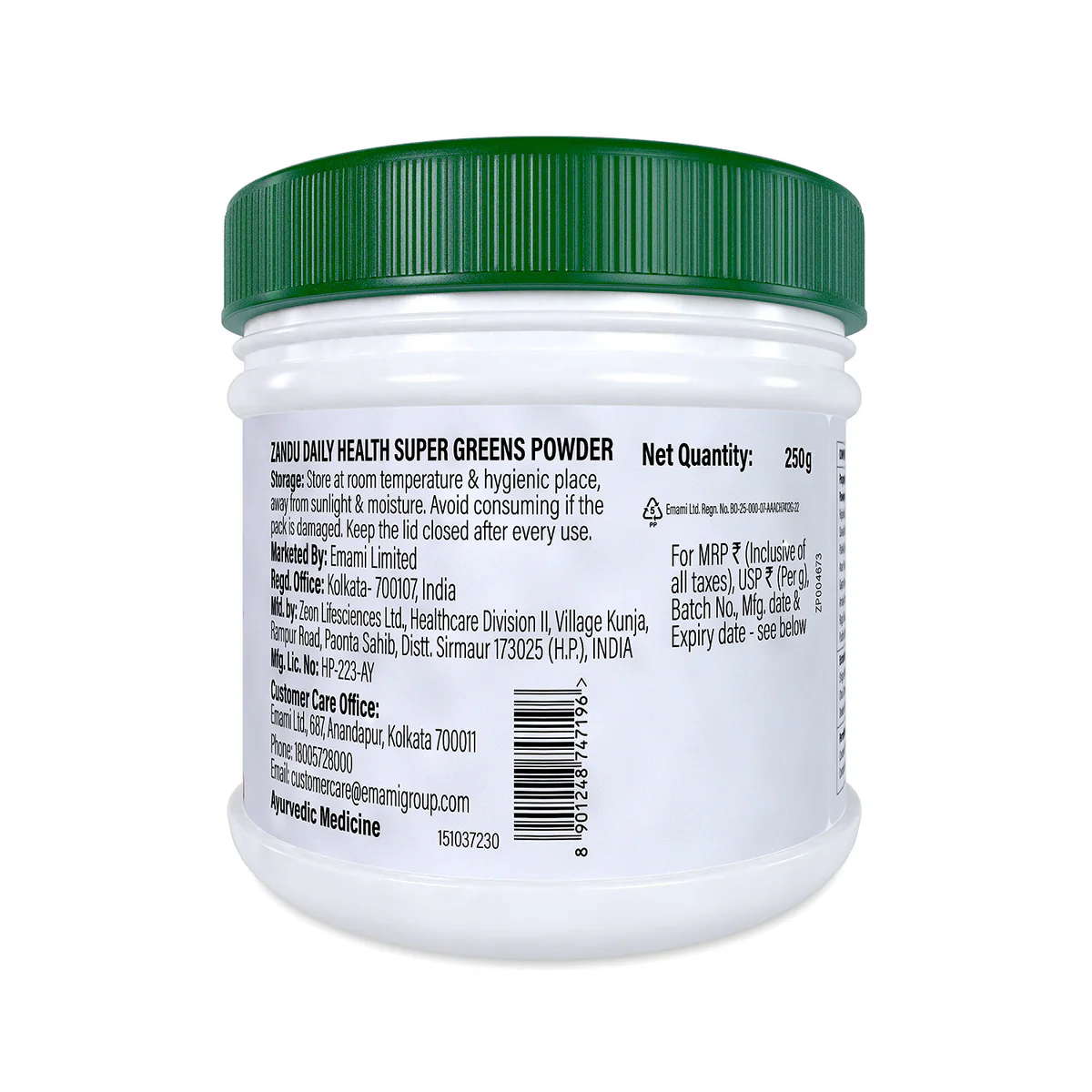 Zandu Daily Health Super Greens multivitamin powder contains a potent mix of 100% natural, health-promoting active ingredients like Amlaki, Palak, Anar, Shigru, Pudina, Rajsimbi, Draksha, Moringa, Carrot, and Ragi. Thanks to its rich composition, it offers numerous benefits, such as supporting skin, eye, heart, and bone health, better digestion, and providing relief from constipation. Formulated by Ayurveda experts of ZAARC (Zandu Advanced Ayurvedic Research Center) and backed by over 100 years of Zandu’s legacy and trust, this Daily Green supplement is free from added sugar, chemicals, colours, preservatives, and gluten. In our busy daily lives, maintaining good health and consuming a variety of nutritious foods can be challenging. Zandu Daily Health Super Greens simplifies this by providing the essential nutrition your body needs.