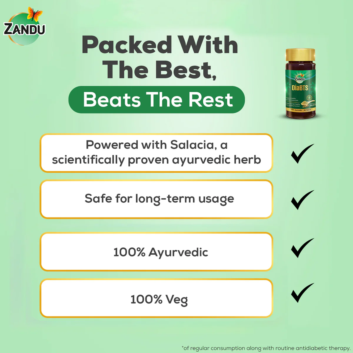 Powered by Salacia (Saptarangi): A trusted Ayurvedic herb known to support healthy blood sugar balance. Zandu Dia-BTS Tablets harness this scientifically validated ingredient to help maintain healthy glucose levels and support overall metabolic health naturally. Easy to Follow Dosage: Take 1 tablet twice daily or directed by your physician. Consistent use is key to achieving optimal results*. Developed at the Zandu Advanced Ayurvedic Research Centre (ZAARC), where Ayurveda's wisdom meets cutting-edge technology. With state-of-the-art labs and rigorous quality checks, ZAARC ensures purity and efficacy. From authentic raw herbs to innovative formulations, we set new standards in Ayurvedic research and healthcare solutions.