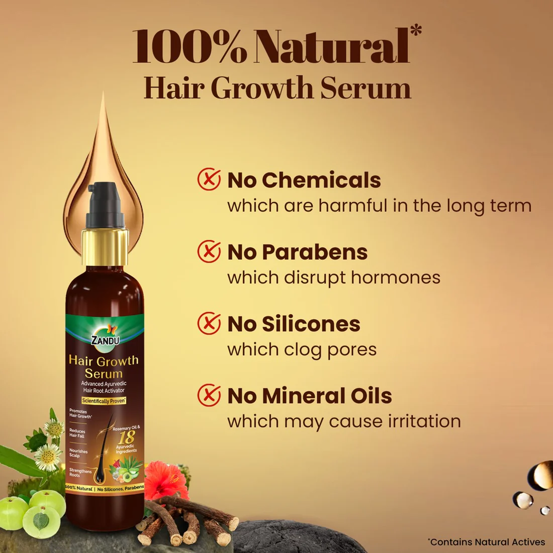 Infused with 19 powerful Ayurvedic ingredients, including Rosemary Oil, Amla, Bhringraj, Hibiscus, Neem, Almond Oil, Lemongrass Oil, and Coconut Oil, this non-sticky and non-greasy hair serum is easy to apply. Backed by Zandu’s 100+ years of trust and expertise in Ayurveda, our hair serum is made with 100% natural ingredients and is free from harmful chemicals, parabens, silicones, artificial fragrances, and colours, making it the best Ayurvedic hair serum in India.