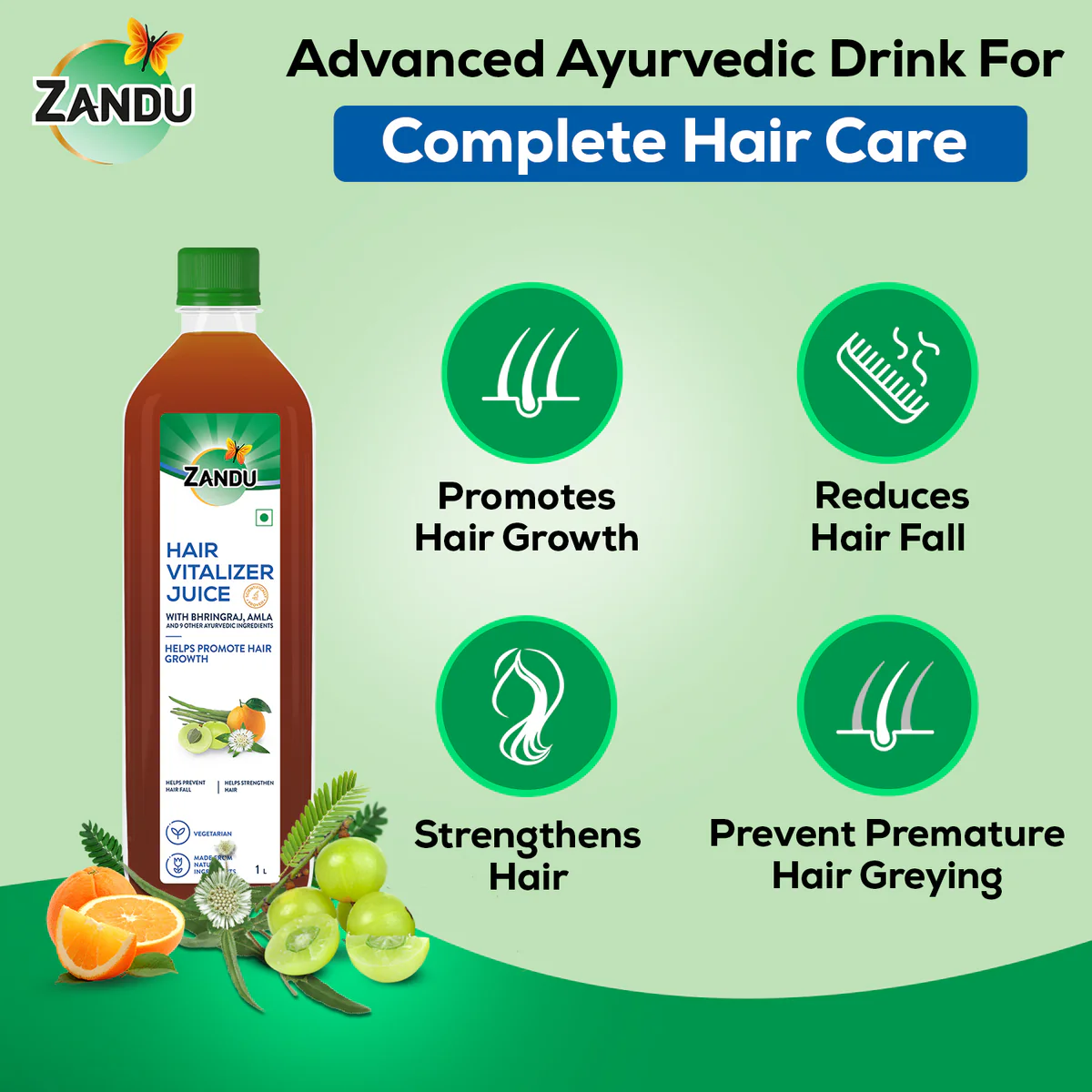 Revitalise your hair with scientifically proven Zandu Hair Care Juice – the ultimate solution rich in nutrients like Vitamin B2 and Biotin, which are all proven to promote hair growth, tackle hair fall, and prevent premature greying. Unlike conventional hair oils and external hair treatments, our unique juice formula works internally, addressing hair concerns at their source for enduring results. Experience the triple benefits of reduced hair fall (Khalitya), prevention of premature greying (Palitya), and promotion of hair growth juice (Keshvardhan), while maintaining healthy, gorgeous hair.