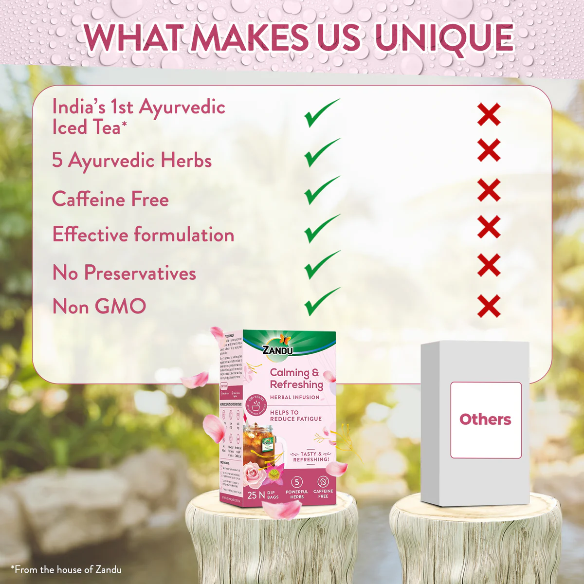 Looking for an alternative to your iced tea? You must try our 100% Ayurvedic Zandu Calming & Refreshing Herbal Infusion tea bags. This powerful vegetarian formulation is made with natural herbs and spices. In today’s fast-paced world, we always strive to give our best. Sometimes, after a long day at work, we feel exhausted and need something to boost our energy levels. Zandu Calming & Refreshing Herbal Infusion tea bags can be your best friend in these situations. They are a 100% natural and effective solution capable of restoring our energy levels and reducing fatigue and stress.