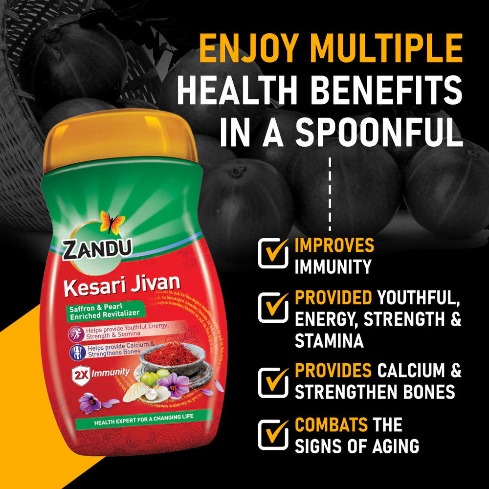 Zandu Kesari Jivan stands as a unique Ayurvedic blend crafted with saffron, pearl, fresh amla, rare herbs, aromatic spices, and essential trace minerals. Developed by ZAARC (Zandu Advanced Ayurvedic Research Centre), it holds the 100 years of trust and legacy of Zandu. Incorporate Zandu Kesari Jivan Chyawanprash into your lifestyle and elevate your immunity and overall wellness.
