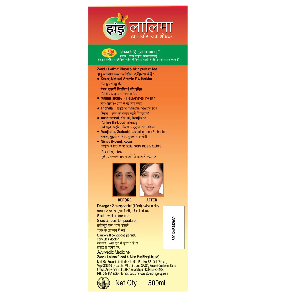 Zandu Lalima is the best blood purifier syrup and is highly recommended for the treatment of Skin irritations like Acne &, Pimples. It is an entirely natural and Ayurvedic blood-purifying tonic that works internally. Cleansing and purifying your body effectively eliminates toxins contributing to pimples, acne, and dull skin. Regularly consuming Lalima syrup has been scientifically proven to maintain clear and radiant skin, and it comes with the endorsement of Ayurvedic experts. Additionally, it has a pleasant taste for a better experience.