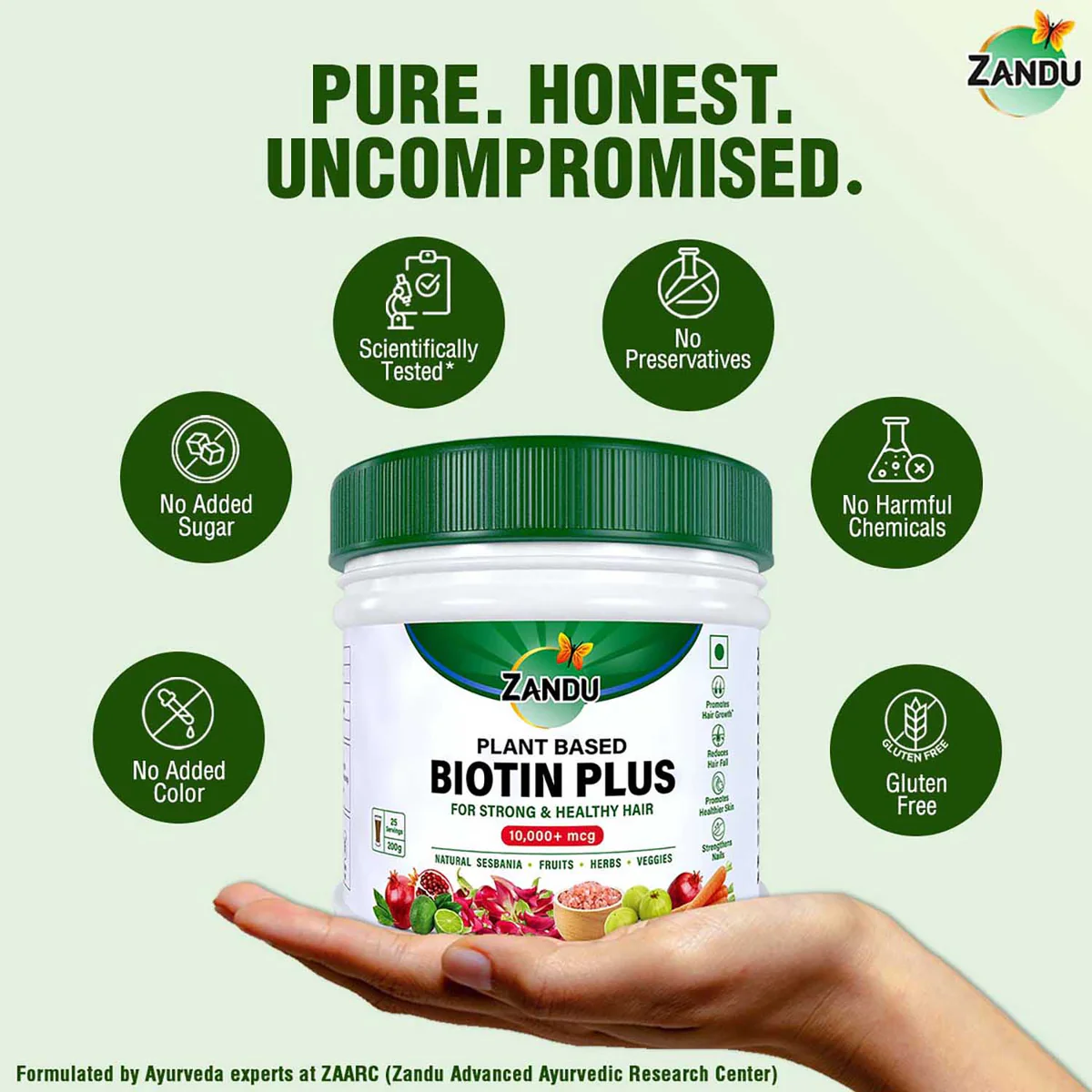 Zandu Plant Based Biotin Plus is a Natural Biotin in a convenient powder format. It is crafted with plant based Biotin from Sesbania (an Ayurvedic herb) to maintain strong & healthy hair. A deficiency of Biotin (Vitamin B) in the body often leads to hair thinning, weak strands and slow hair growth. The human body cannot produce biotin on its own, hence it is essential to incorporate Biotin through diet or other forms of healthy lifestyle choices.