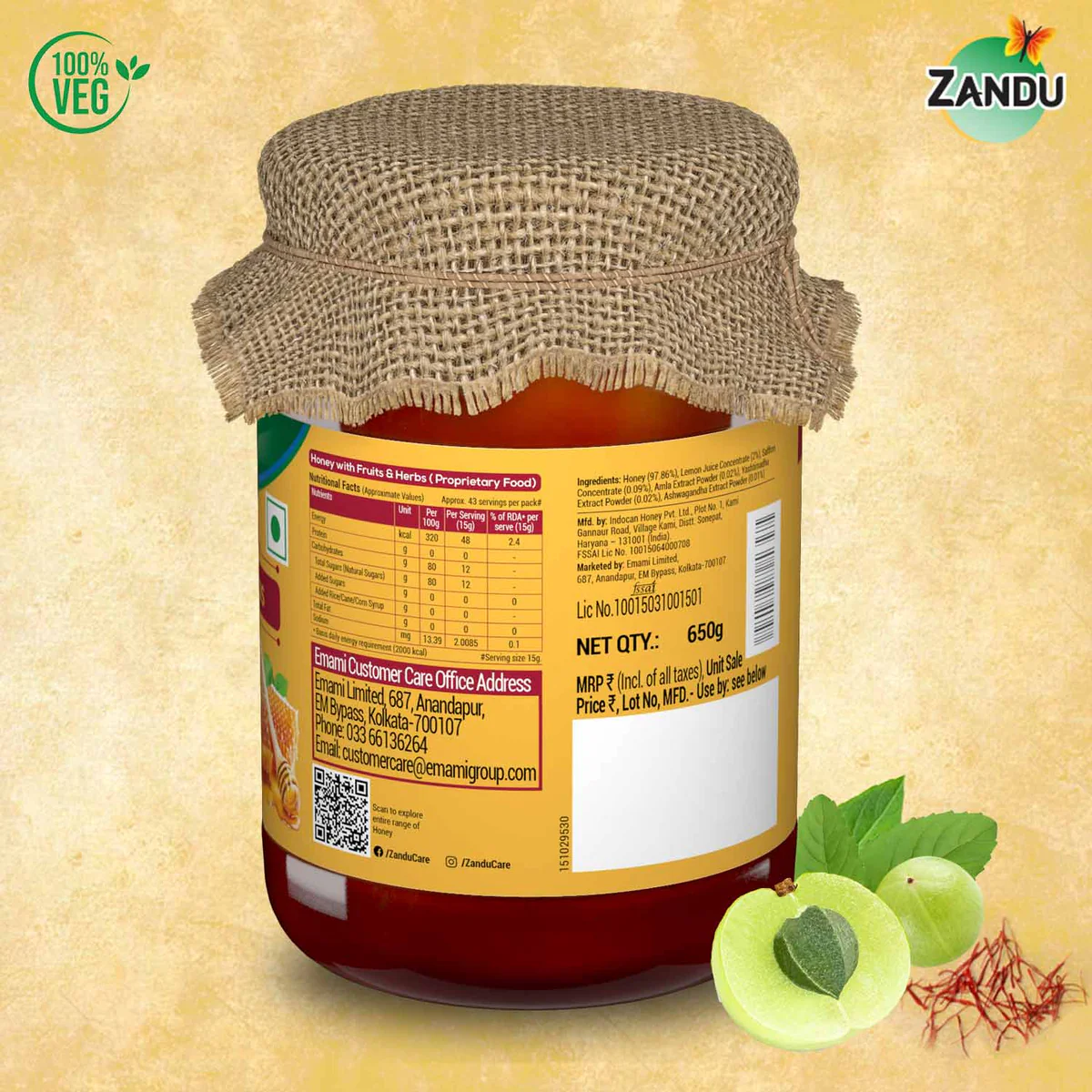 Zandu Pure Honey with Fruits & Herbs is enriched with Lemon juice, Saffron, Amla, Yashtimadhu (liquorice), and Ashwagandha to create a formulation that offers a variety of benefits. With so many power-packed nutrients, this honey can help boost immunity and helps maintain healthy respiratory function. It is a natural energy booster and helps detoxify, improves gut health, and has anti-inflammatory and antioxidant properties. This honey is also helpful in relieving stress. With this honey, you benefit from time-tested remedies without having to source or process these ingredients into your diet separately. Available in a simple jar form, you get pure and authentic essentials in one go with every spoonful.
