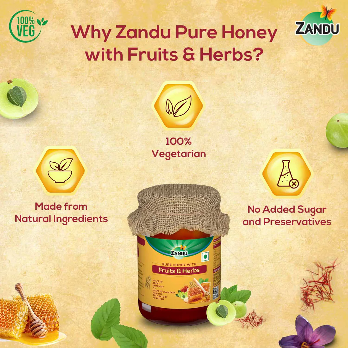 In today’s world, we are presented with plenty of foods that are promised to offer numerous health benefits. With so many options to choose from, it becomes impossible to verify their claims and decide on a product that is truly good for you. With Zandu products, you can be assured that you are opting for more than 100 years of quality and trust, backed by over 5000 years of Ayurvedic wisdom and practices. We believe in wellness without compromise, and therefore, we bring you Zandu Pure Honey with Fruits & Herbs, a natural product with a variety of health benefits. This honey is enriched with the goodness of essential fruits and herbs to add to its delicious flavour and infuse additional health benefits.