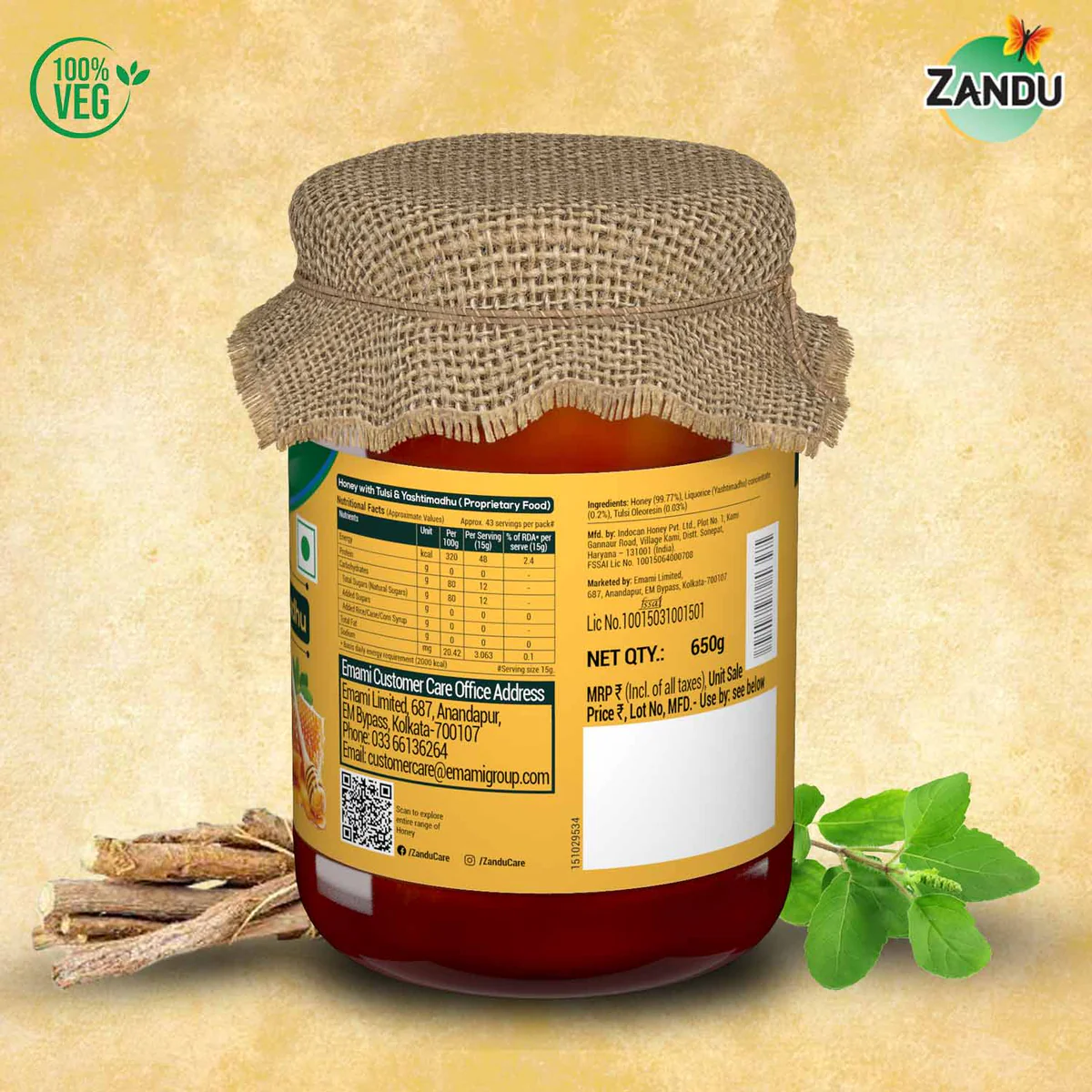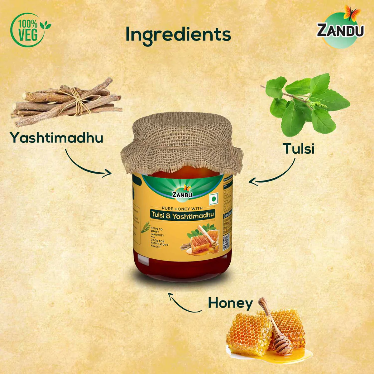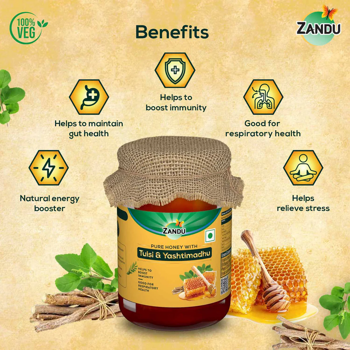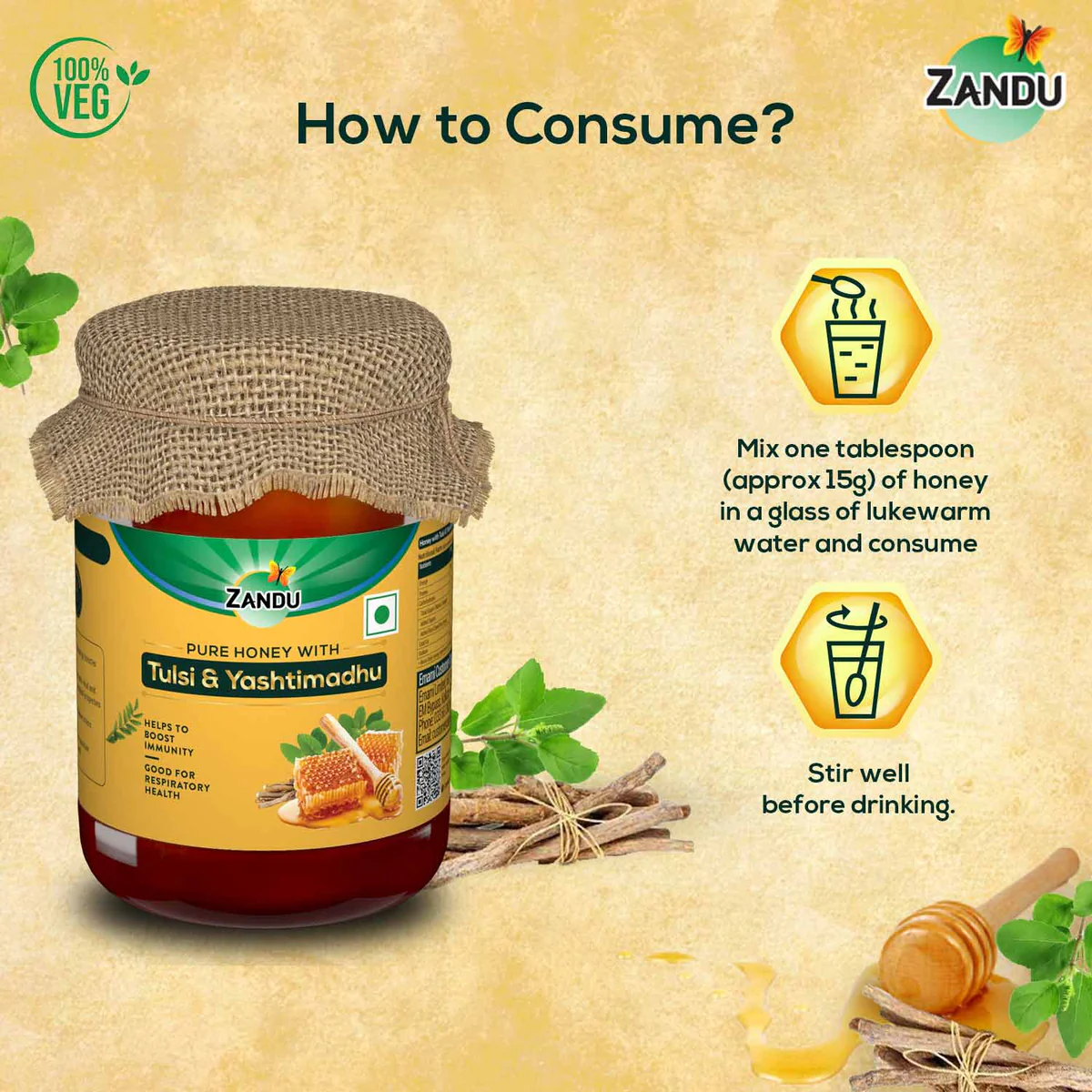Since ancient times, Ayurvedic herbs and ingredients have been used for maintaining good health and wellbeing. But in today’s scenario, we want these powerful ingredients to be made available in an easy-to-use form. Enriched with the goodness of natural ingredients, Zandu Pure Honey with Tulsi & Yashtimadhu is specially curated to meet these needs in a convenient and hassle-free way. This Honey is a valuable addition to your diet because of its ease of use, delicious taste and multiple health benefits. It helps boost immunity and maintains healthy respiratory function. It is also a natural energy booster that relieves stress and improves gut health. Zandu Pure Honey with Tulsi & Yashtimadhu is vegetarian and made from natural ingredients, without additives like sugar, salt, artificial flavours and colours. Regular consumption of this value-added honey is a great way to get closer to your overall health requirements.