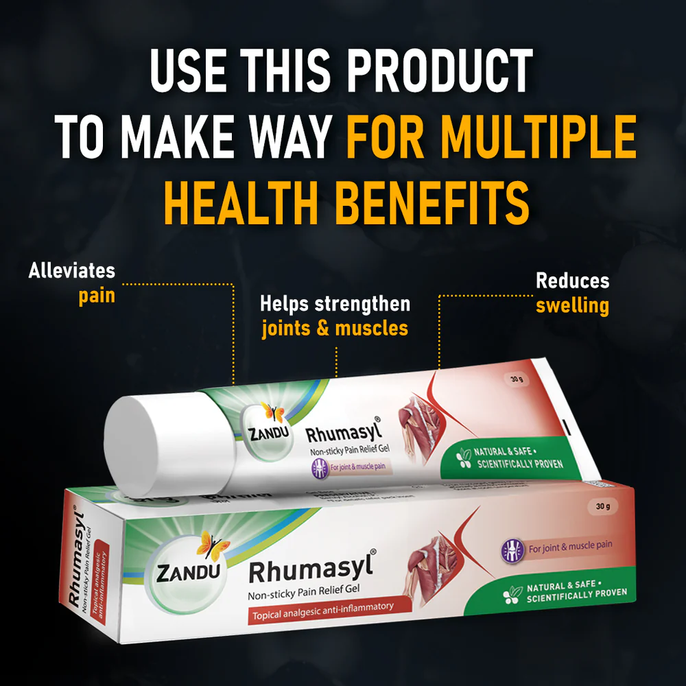 This pain relief gel is formulated with a blend of four Ayurvedic essential oils: Vishgarbha Tail, Mahamash Tail, Gandhpuro Tail, and Narayan Tail. All of these oils retain effective anti-inflammatory and analgesic properties, proving beneficial in relieving pain, enhancing the mobility of joints, and strengthening joints and muscles. Developed by the Ayurvedic experts at ZAARC (Zandu Advanced Ayurvedic Research Center), this gel holds 100 years of history and the legacy of Zandu in Ayurveda. It is non-sticky, natural, and scientifically proven. Say goodbye to the painful days with Zandu Rhumasyl Gel and improve your strength and mobility.