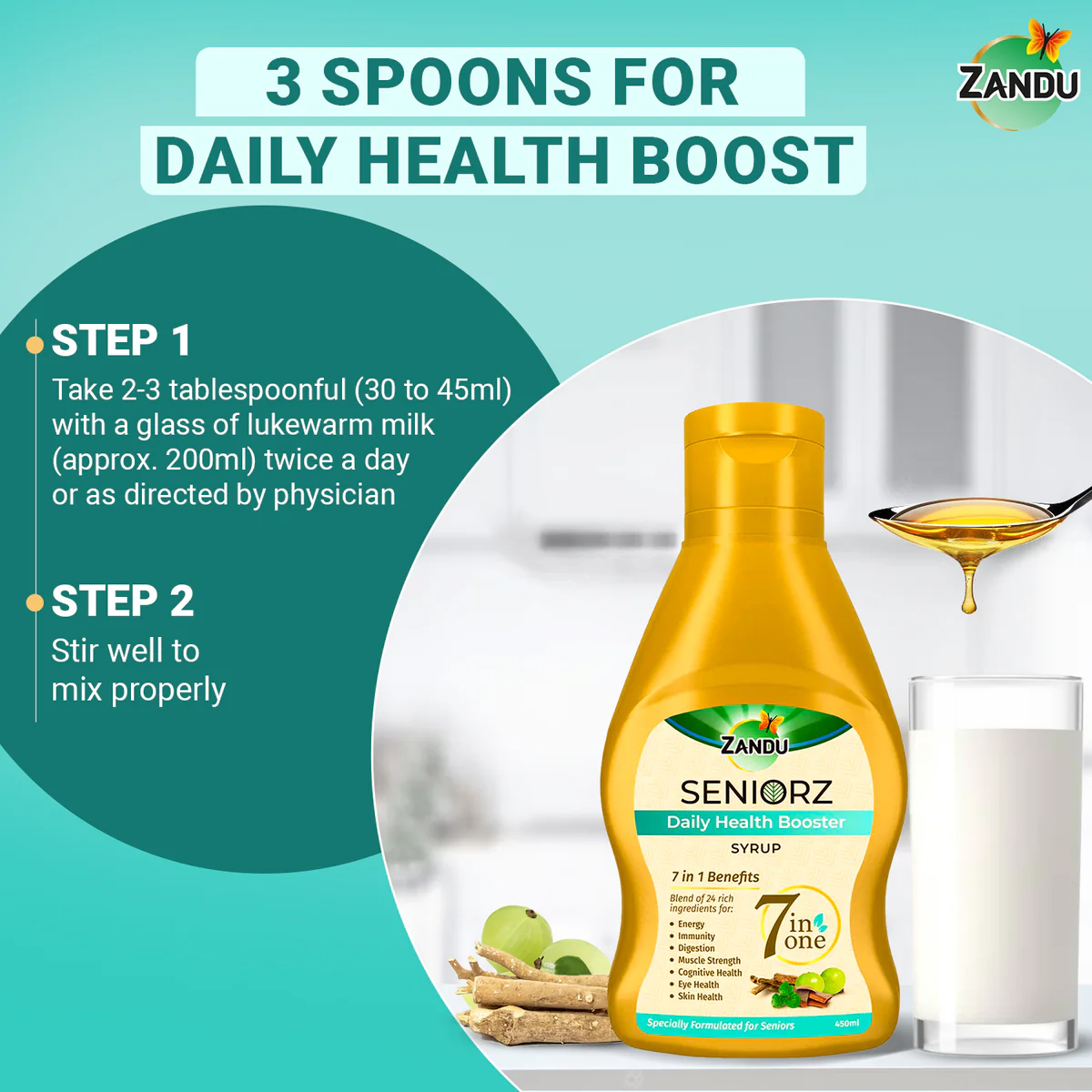 Presenting the scientifically tested Zandu Seniorz Daily Health Booster Syrup, specially formulated for senior citizens to improve energy, immunity, digestion, muscle strength, cognitive health, eye health, and skin health. Age brings a plethora of ailments, as your body has gone through a lot of wear and tear over the years. You start losing your sheen, energy, immunity, and more. This syrup helps to strengthen and improve your health holistically.