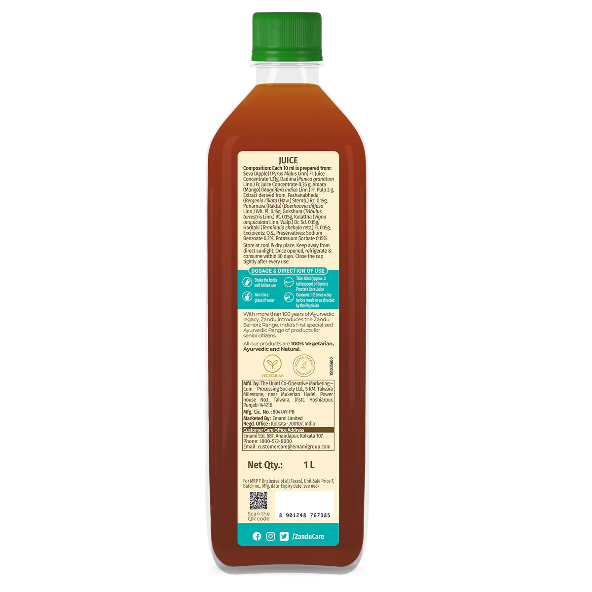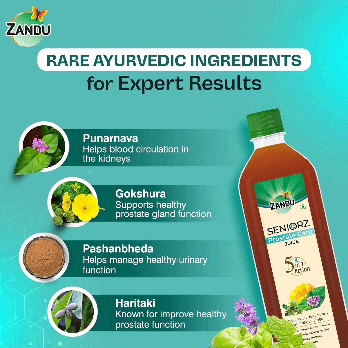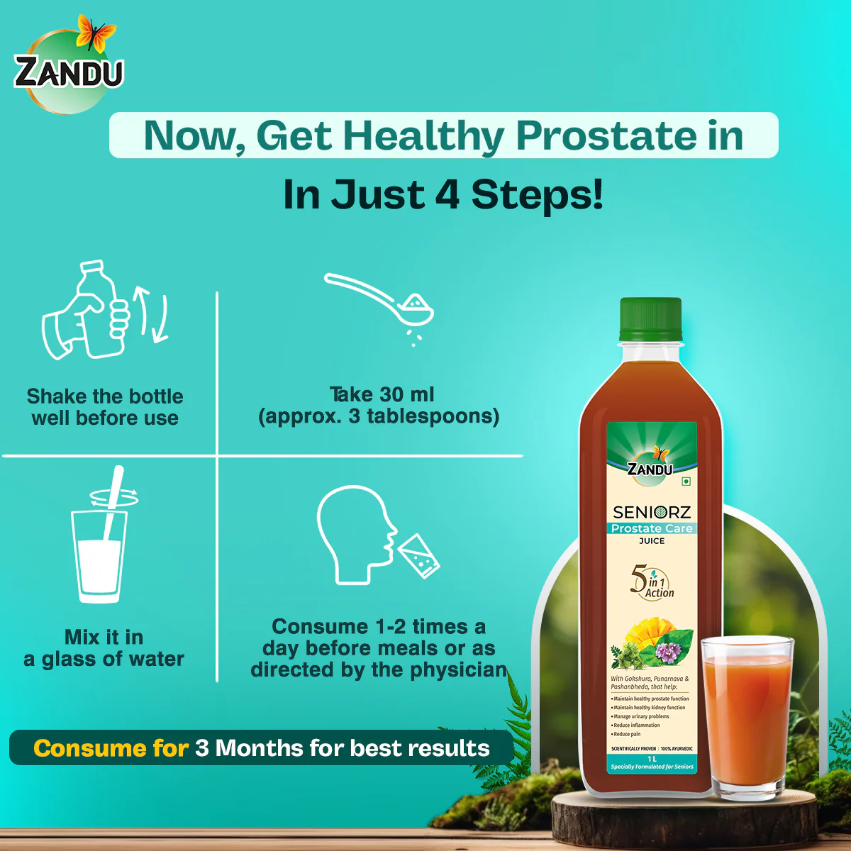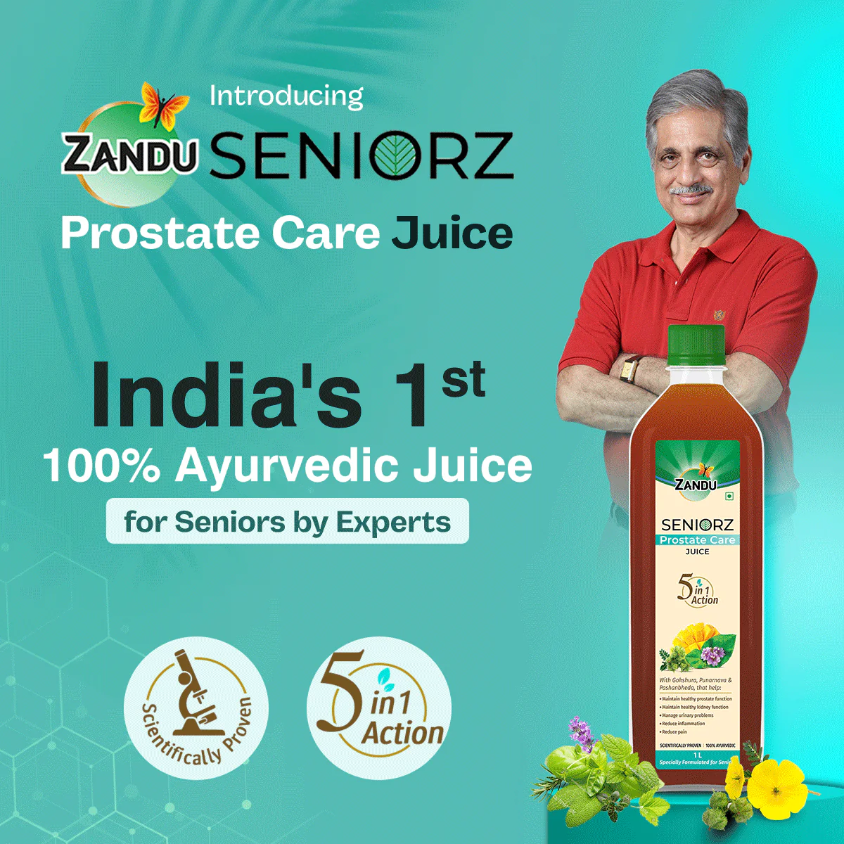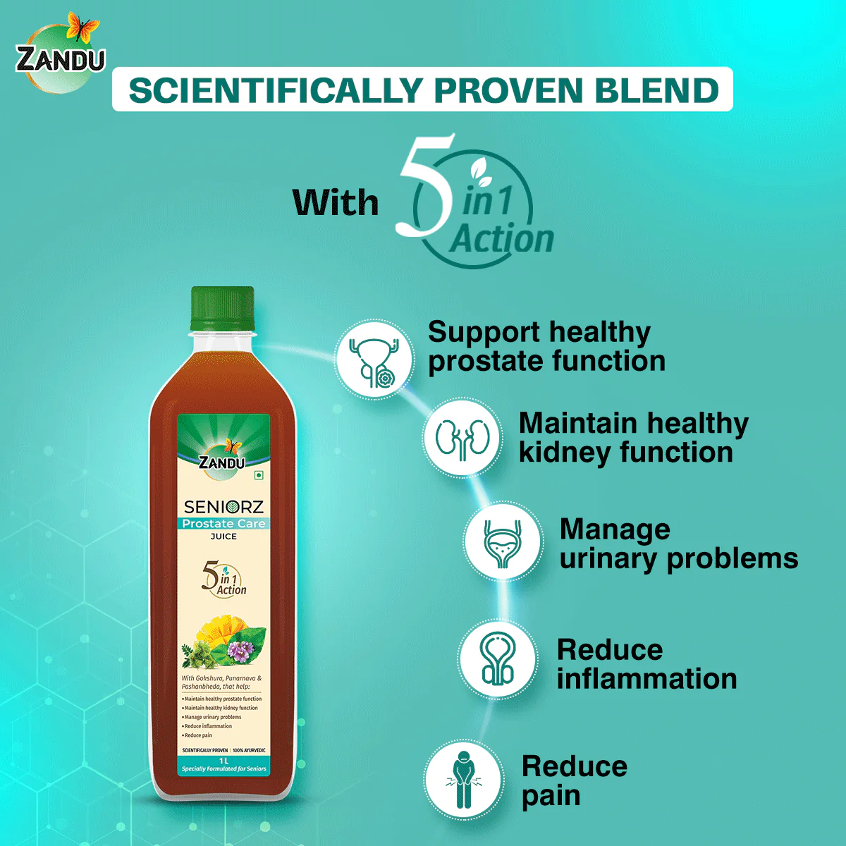 Zandu Seniorz Prostate Care Juice is India’s 1st 100% Ayurvedic Juice made by experts for seniors that helps to maintain overall prostate health. This scientifically proven Ayurvedic juice is made from 100% natural actives. It provides 5-in-1 benefits by supporting healthy prostate function, maintaining healthy kidney functions, managing urinary functions, reducing inflammation & decreasing pain. It is made using Gokshura, Punarnava, Pashanbheda, and Haritaki, four of the potent diuretic, and anti-inflammatory herbs of Ayurveda along with other powerful ingredients, renowned for treating prostate issues and urinary disorders. Prostate issues are a common phenomenon, especially in men aged over 50.